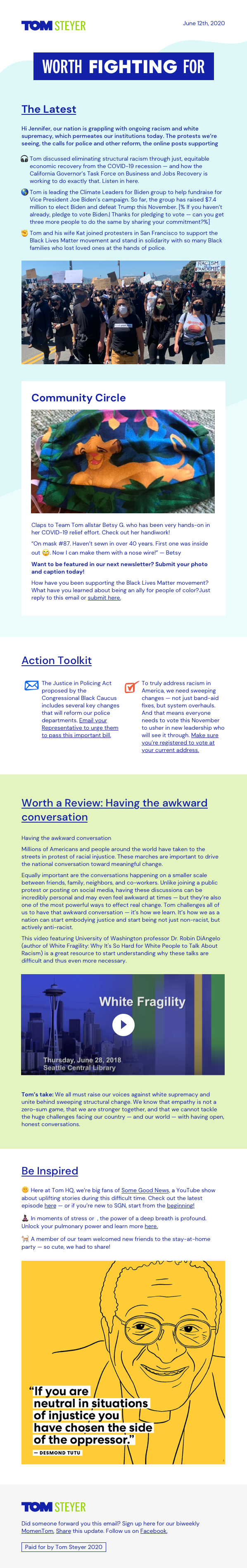 Newsletter email template for Tom Steyer, 2020